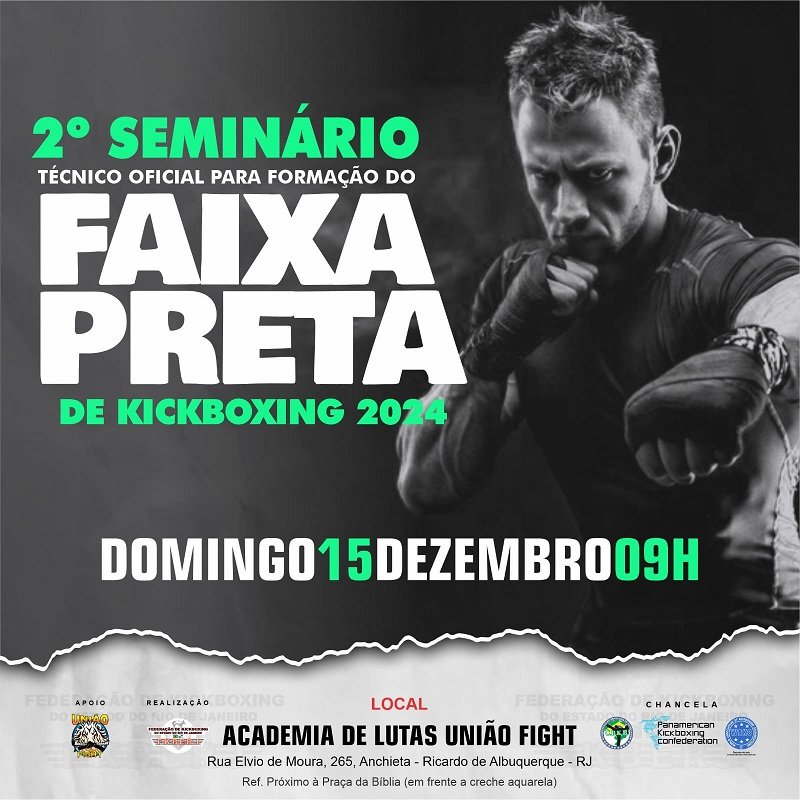 Informo aos interessados que o 2º Seminário Técnico Oficial para formação do Faixa Preta de Kickboxing 2024, será realizado na Academia de Lutas União Fight, Rua Elvio de Moura, 265, Anchieta – Ricardo de Albuquerque – RJ, Ref. Próximo à Praça da Bíblia (em frente a creche aquarela), 15.12.2024 às 09 h. A inscrição poderá ser feita até o dia 10.12.2024.