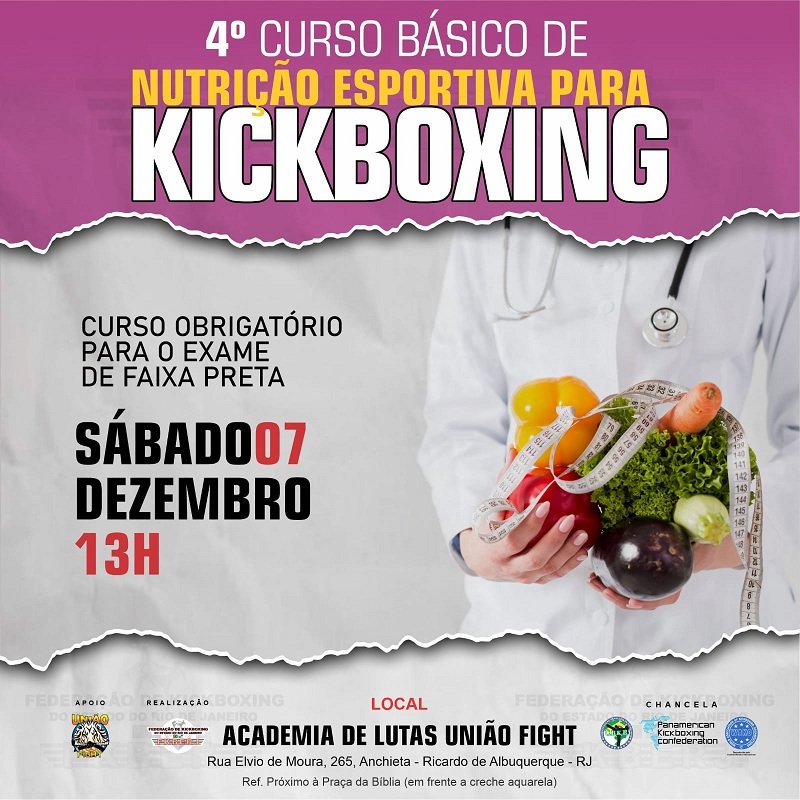 Informo aos interessados que o 4º Curso Básico de Nutrição Esportiva para Kickboxing 2024 será realizado na Academia de Lutas União Fight, Rua Elvio de Moura, 265, Anchieta – Ricardo de Albuquerque – RJ, Ref. Próximo à Praça da Bíblia (em frente a creche aquarela), 07.12.2024 às 13 h. A inscrição poderá ser feita até o dia 03.12.2024.