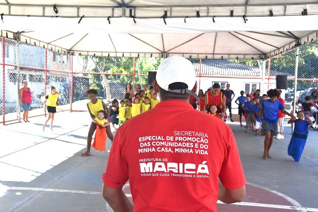 A Prefeitura de Maricá, por meio da Secretaria Especial de Promoção das Comunidades e do Minha Casa, Minha Vida, realizou nesta segunda-feira (21/07) mais uma edição da Colônia de Férias das Comunidades, desta vez no residencial Carlos Marighella (Minha Casa, Minha Vida), em Itaipuaçu. Ao todo, cerca de 60 crianças participaram das atividades, que incluíram circuito de brincadeiras, corrida no saco, queimado e disputas em equipe.