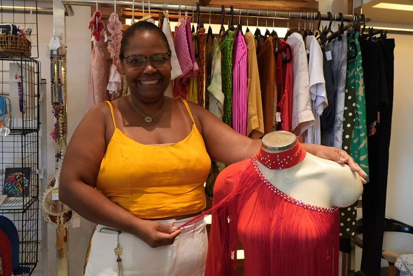 Uma das expositoras da loja é Cleide Medeiros, de 57 anos. A gonçalense é costureira e participou da capacitação do projeto. Depois do curso de empreendedorismo, ela ampliou os seus negócios e expõe diversas roupas no Espaço Lidera Mulher.