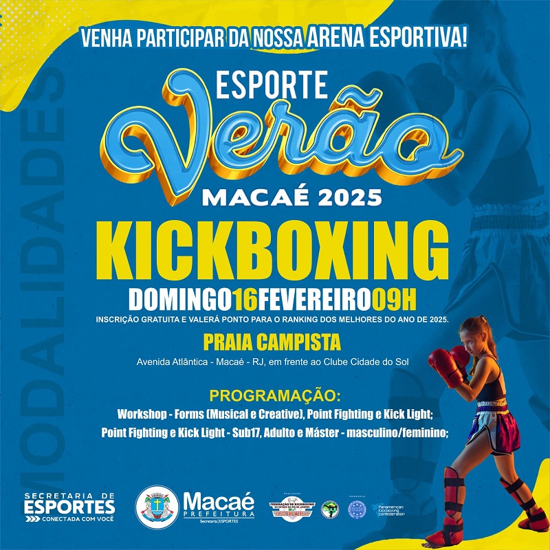 Informo aos interessados, que o Esporte Verão Kickboxing Macaé 2025, será realizado na Praia Campista, Avenida Atlântica – Macaé – RJ, em frente ao Clube Cidade do Sol, no dia 16.02.2025, às 11h.