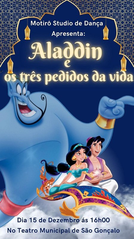 Já às 16h do domingo, no Teatro Municipal, a Motirô Studio de Dança apresenta “Aladdin e os Três Pedidos da Vida”, um espetáculo de dança e teatro que resgata a magia do clássico Aladdin, mas com uma abordagem inédita e profunda. Dirigido por Gilbert Souza, o espetáculo convida o público a refletir sobre os verdadeiros desejos da vida, com coreografias marcantes e uma narrativa inspiradora. Ingressos via WhatsApp: Gilbet / (21) 98006-4908.