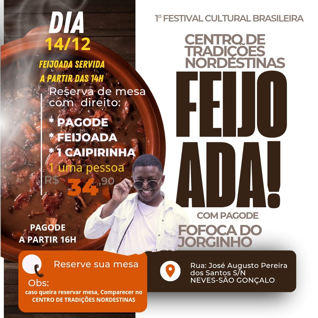No dia 14, sábado, o Centro de Tradições Nordestinas de São Gonçalo abre suas portas para o 1º Festival da Cultura Brasileira. O evento terá início às 14h com uma deliciosa feijoada, servida aos participantes por apenas R$ 34,90 por pessoa, e a festa continua com roda de pagode ao vivo, comandada pelo talentoso Jorginho Cardozo, a partir das 16h. Para garantir sua mesa, é necessário realizar a reserva diretamente no Centro de Tradições Nordestinas.