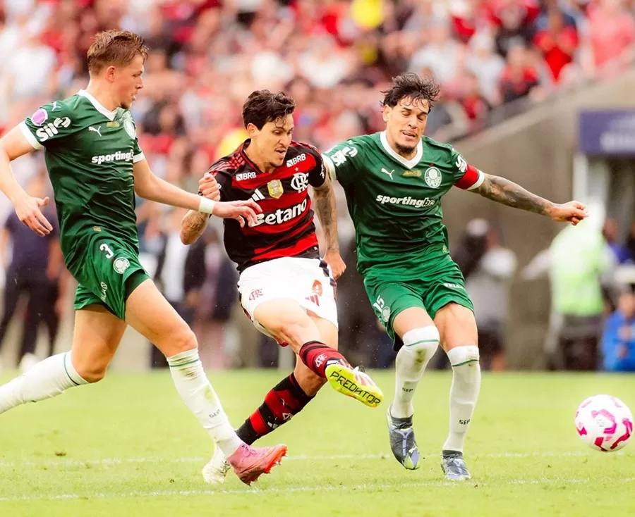Ontem os comandados de Filipe Luís deram um importante passo na briga pelo título do Brasileirão 2025, o Rubro-negro venceu por 3 a 2 uma partida difícil e recheada de polêmicas. O Palmeiras começou a partida indo pra cima do Flamengo, mas foi durante a pressão inicial do time paulista, que Rossi fez uma ligação direta com Pedro, que fez o pivô e deixou Arrascaeta na cara do gol pra abrir o placar aos 9 minutos. Com a desvantagem no placar o Palmeiras seguiu partindo pra cima até que aos 24 minutos Vitor Roque empatou a partida com belo cabeceio. Aos 37 minutos da primeira etapa foi assinalado pênalti de Bruno Fuchs em cima de Pedro, sob muitos protestos da equipe alviverde, o time de Abel Ferreira reclamou de falta na origem da jogada, Wilton Pereira Sampaio não quis saber de reclamações e confirmou o pênalti claro que havia marcado. Ainda sobrou tempo pro Flamengo ampliar o marcador com Pedro, depois de uma saída de bola errada o atacante aproveitou a chance e colocou 3 a 1 no placar aos 45 do primeiro tempo.