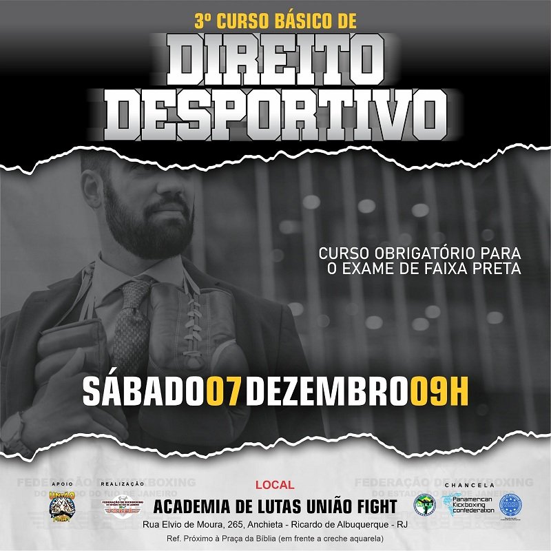 Informo aos interessados que o 3º Curso Básico de Direito Desportivo 2024 será realizado na Academia de Lutas União Fight, Rua Elvio de Moura, 265, Anchieta – Ricardo de Albuquerque – RJ, Ref. Próximo à Praça da Bíblia (em frente a creche aquarela), 07.12.2024 às 09 h. A inscrição poderá ser feita até o dia 03.12.2024.