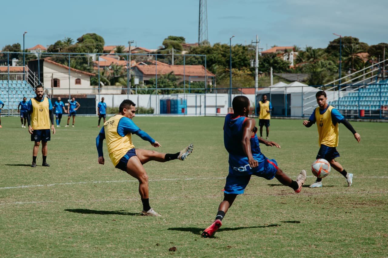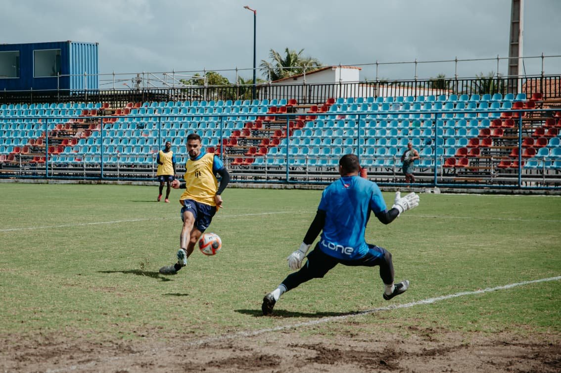 Meias Marcelo (colete laranja) e Hugo Borges (logo atrás de camisa azul) estão recuperados de lesão e à disposição do técnico Reinaldo - Foto/Divulgação: Paulinne Carvalho/Comunicação Maricá F.C