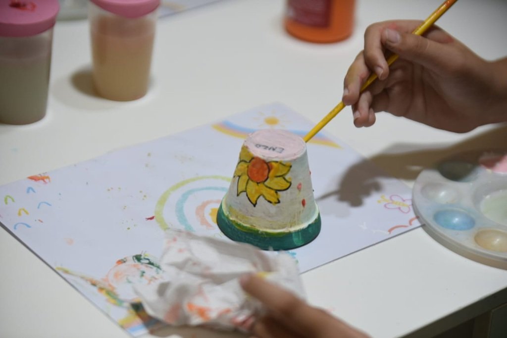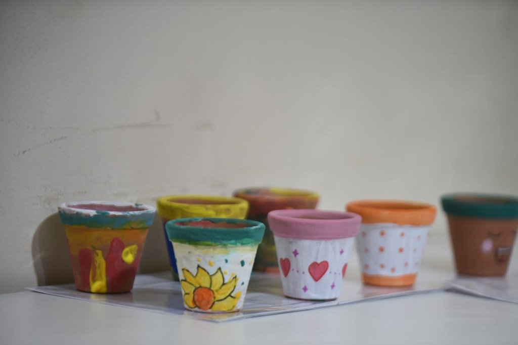 Durante a oficina, as crianças participaram de atividades como pintura em vasos de barro e pinturas em tela. Com o apoio de educadores especializados, os alunos foram estimulados a desenvolver habilidades cognitivas, motoras e criativas.
