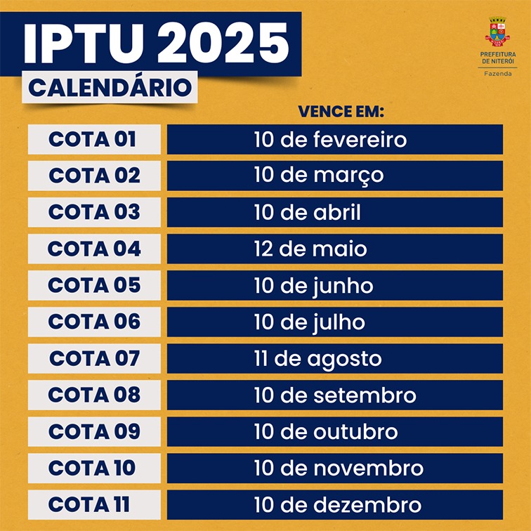 O prazo para o pagamento do Imposto Predial e Territorial Urbano (IPTU) em cota única termina no dia 7 de fevereiro (sexta-feira). O IPTU 2025 pode ser pago a partir das cartas enviadas à residência dos contribuintes. As cartas serão entregues até o final de janeiro. O tributo também está disponível para emissão online através do Portal de Serviços de Niterói (www.servicos.niteroi.rj.gov.