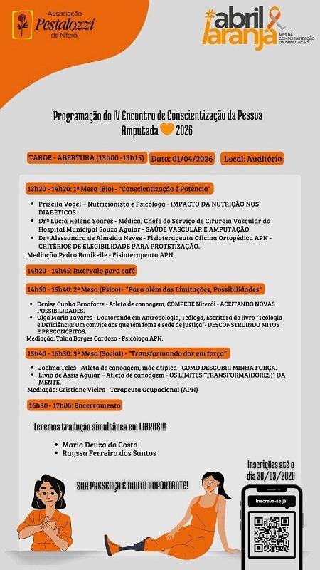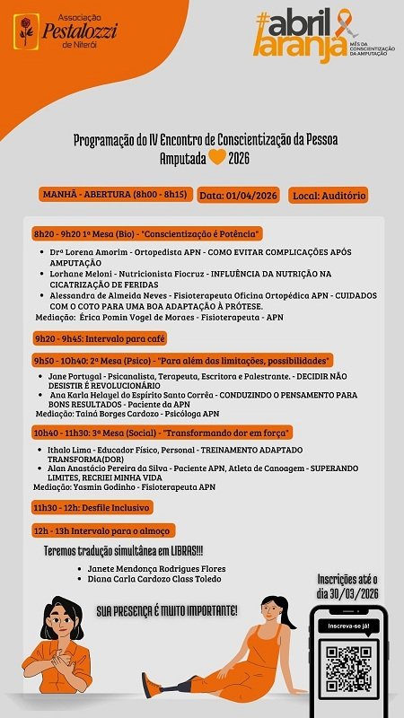 A Associação Pestalozzi de Niterói realiza nesta quarta-feira, 1º de abril, o IV Encontro de Conscientização da Pessoa Amputada, no auditório da instituição. O evento integra a programação do Abril Laranja, mês dedicado à conscientização sobre a amputação, e reúne profissionais da saúde, especialistas, pacientes e atletas em uma jornada de debates, informação e inclusão.