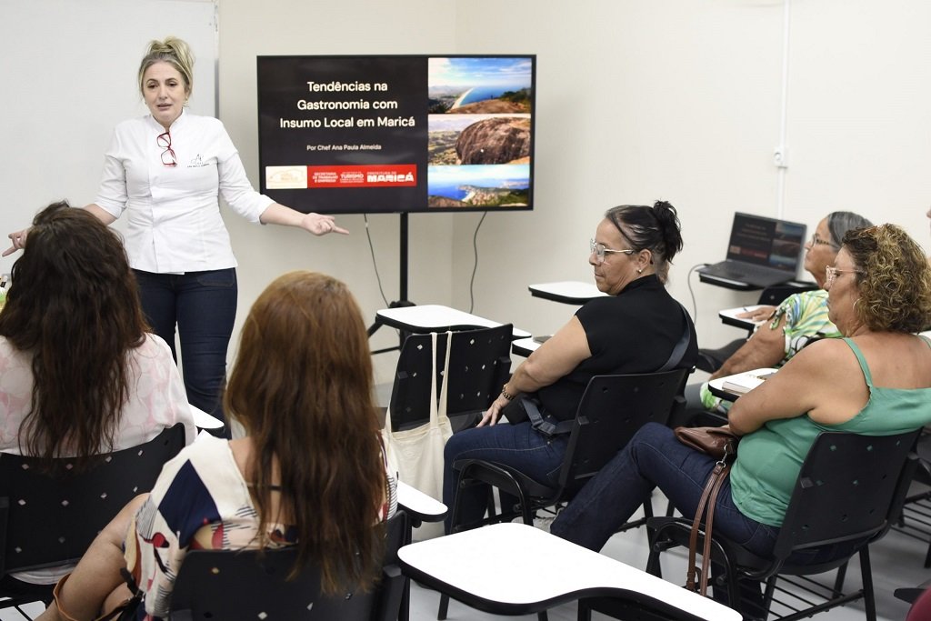 A Prefeitura de Maricá, por meio das secretarias de Turismo, de Comércio, Indústria e Mercado Interno, e de Trabalho e Emprego, em parceria com a Rota Gastronômica, capacitou empreendedores do setor de bares e restaurantes com o minicurso “Tendências na gastronomia com insumo local”. Dezenas de participantes ouviram dicas da chef Ana Paula Almeida sobre como tornar seus pratos e negócios únicos, atrelando-os a ingredientes locais.