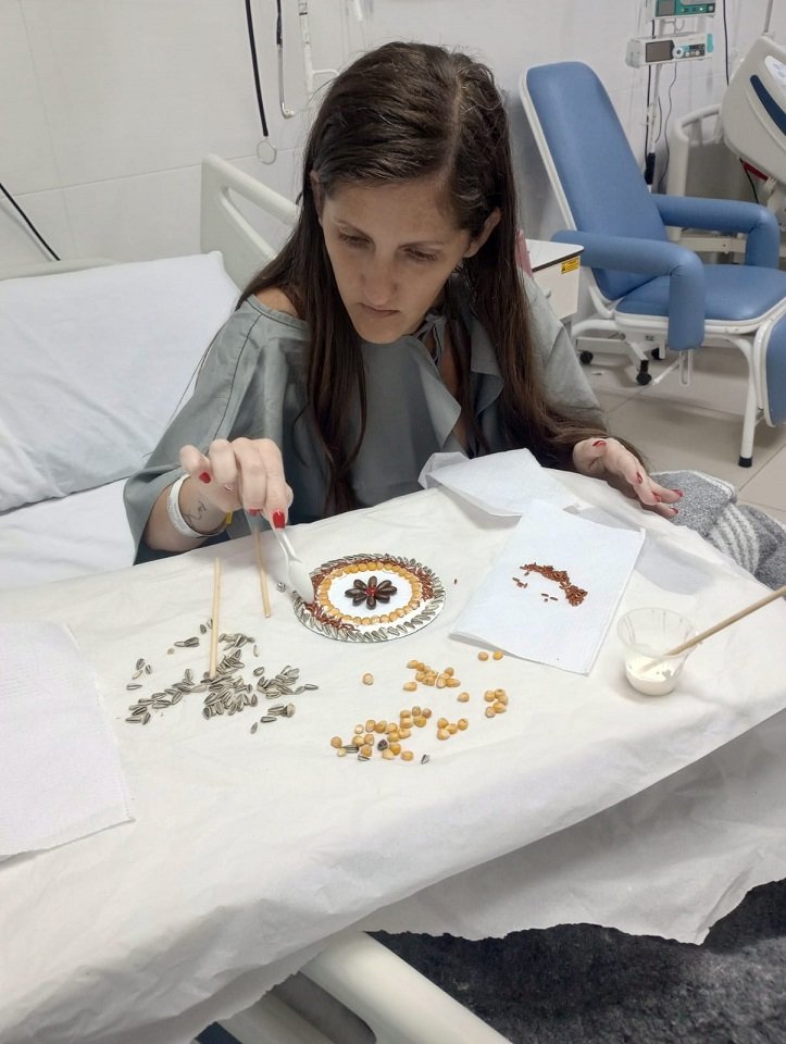 A hospitalização, especialmente quando prolongada, pode provocar ansiedade, stress e a ruptura da rotina ocupacional nos pacientes. Nesse contexto, a arteterapia se torna uma importante aliada no cuidado integral e a confecção de mandalas é uma prática terapêutica capaz de favorecer o relaxamento, a concentração, a organização emocional e a expressão simbólica de sentimentos.