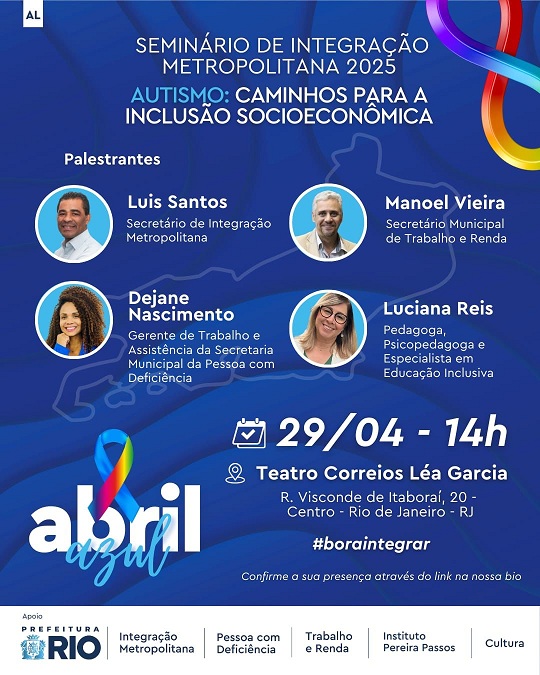 A Secretaria de Integração Metropolitana do Rio organiza o seminário que tem como principal objetivo compartilhar estratégias de sucesso aplicadas nos âmbitos sociais e educacionais para acessibilidade, inclusão e empregabilidade da pessoa com Transtorno do Espectro Autista (TEA). A Secretaria pretende promover reflexão sobre a importância dessas táticas para que elas sirvam de inspiração, incentivando educadores, profissionais da saúde, pais, gestores públicos, entidades da sociedade civil e lideranças da Região Metropolitana do Rio de Janeiro a estimularem a autonomia, valorização e inclusão de pessoas com TEA ao mercado de trabalho. Também para que divulguem essas informações em suas comunidades, ampliando seu alcance em diversos setores da sociedade.