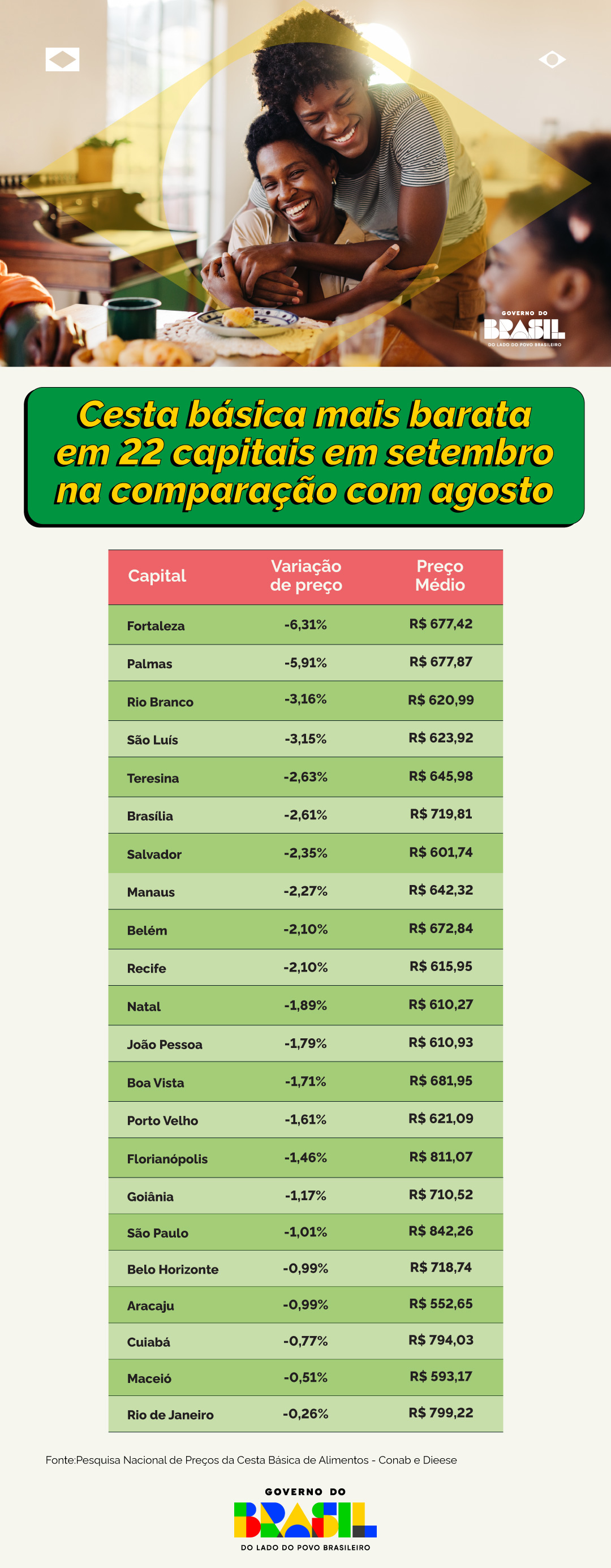 NACIONAL – Em âmbito nacional, as reduções mais expressivas em setembro ocorreram em Fortaleza (-6,31%), Palmas (-5,91%), Rio Branco (-3,16%), São Luís (-3,15%) e Teresina (-2,63%). Os menores valores médios foram registrados em Aracaju (R$ 552,65), Maceió (R$ 593,17), Salvador (R$ 601,74), Natal (R$ 610,27) e João Pessoa (R$ 610,93). O maior custo ficou em São Paulo (R$ 842,26).