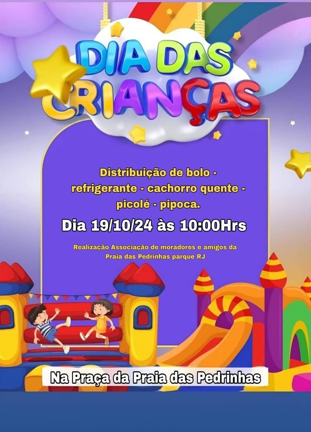 Neste sábado, a partir das 10h, vai acontecer a tão esperada Festa das Crianças na Praia das Pedrinhas em São Gonçalo. Os organizadores do evento conseguiram através de apoio de doadores pula-pula, escorrego, totó, castelo inflável e muito mais. Não existe coisa mais linda, que um sorriso de uma criança. É nosso dever como cidadão proporcionar carinho, proteção e unir forças para que elas tenham direito de brincar, e serem felizes.