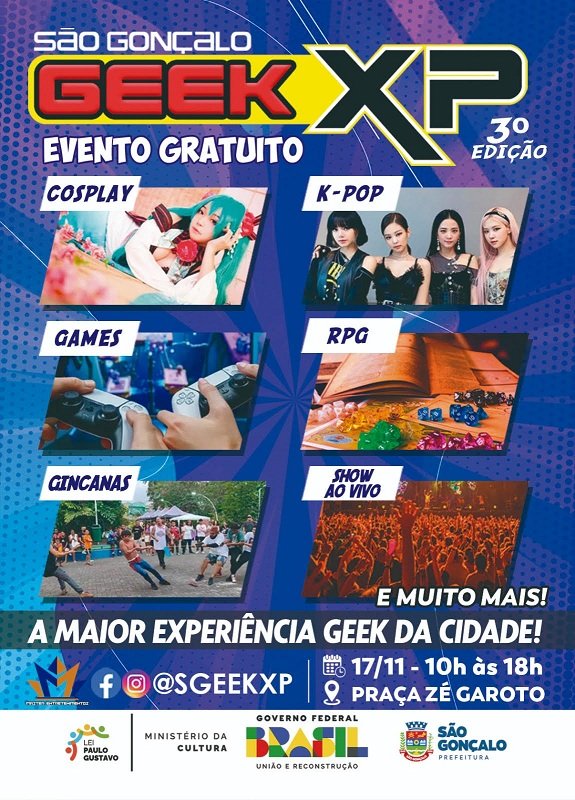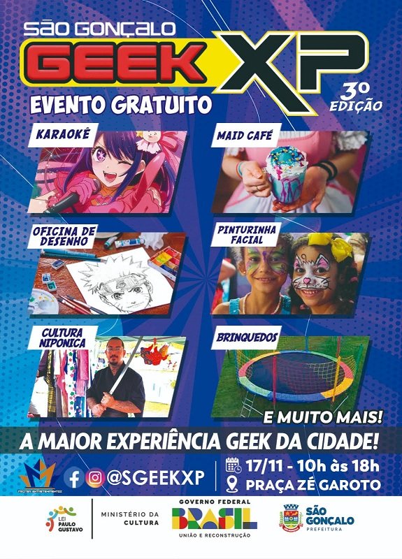 No próximo domingo (17), a partir das 10h, a Praça Zé Garoto será palco do São Gonçalo Geek XP, um evento que promete levar os fãs da cultura pop a uma verdadeira imersão no universo geek. O público poderá participar de uma programação recheada de atrações para todas as idades, com concursos, gincanas, shows, oficinas e muito mais. A feira vai ter o melhor cosplay, k-pop, RPG, video games, anime e uma série de atividades interativas.
