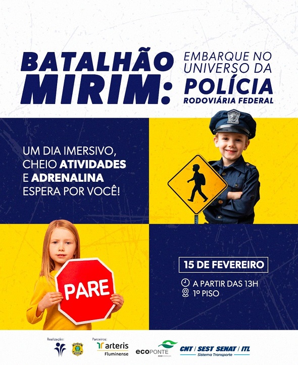 Em mais uma ação pioneira, nos dias 14 e 15 de fevereiro, o São Gonçalo Shopping recebe o Batalhão Mirim – Uma imersão com a Polícia Rodoviária Federal (PRF). O evento, em parceria com Ecoponte, Arteris e SEST/SENAT, tem o objetivo de conscientizar crianças e adultos sobre a importância da educação no trânsito por meio de atividades interativas e educativas.