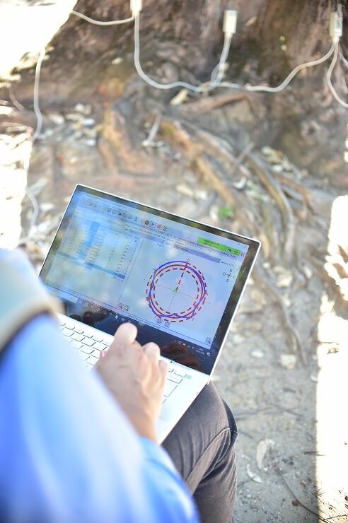 Resultados em tempo real indicam lesão ou apodrecimento – No monitoramento em campo, os resultados são gerados em tempo real e exibidos em gráficos no computador. Áreas em vermelho indicam regiões lesionadas — que podem representar cavidades, apodrecimento interno ou presença de cupins. Em um dos casos analisados, o exame apontou 48% de risco de queda, com indicação precisa da direção mais provável do tombamento.